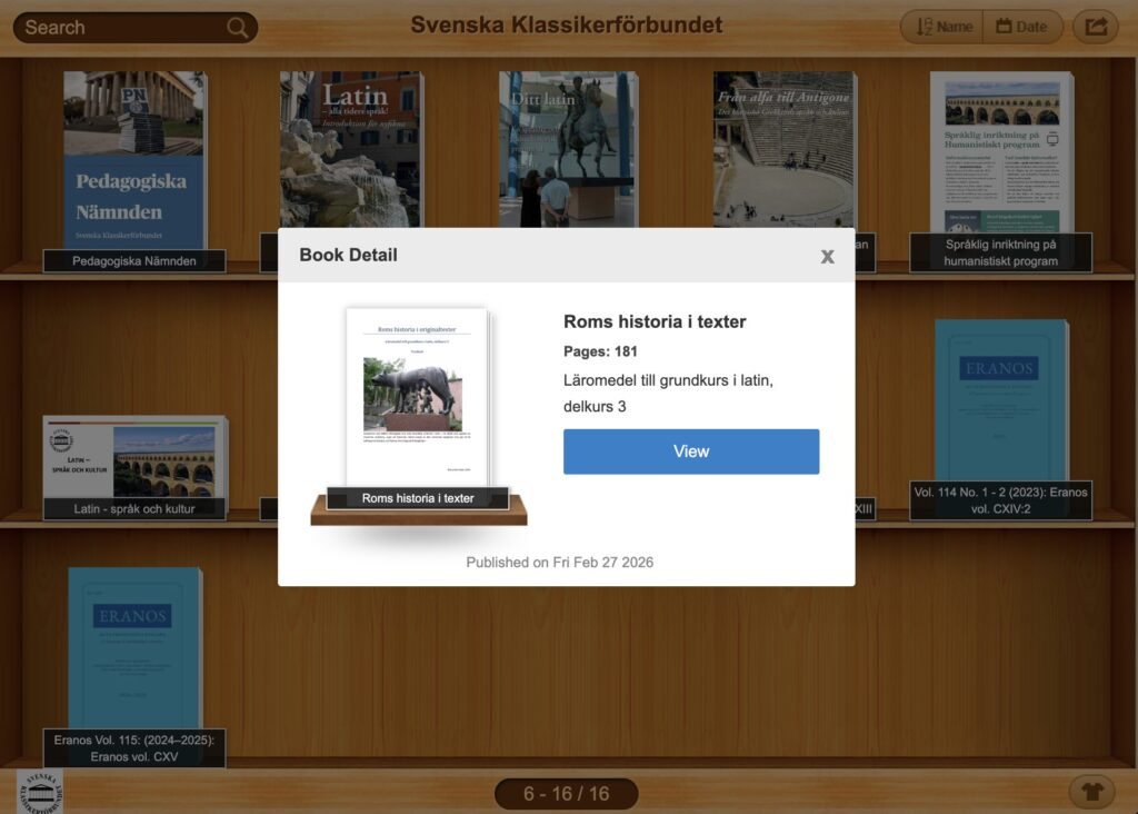 I förbundets bokhylla finns nu Roms historia i originaltexter av professor Gunhild Vidén, Göteborgs universitet. Materialet är ett pedagogiskt läromedel som är utformat för studenter som ska läsa latinska originaltexter på en avancerad nivå. Materialet kombinerar romersk historia med språklig analys genom att presentera centrala författare som Livius, Cicero, Caesar och Augustus. Varje avsnitt innehåller en historisk introduktion följt av källtexter som belyser allt från republikens införande till det romerska kejsardömets expansion. För att stödja inlärningen erbjuds en omfattande kommentardel där meningarnas grammatik och syntax förklaras i detalj. Utöver de politiska och militära skildringarna ges även utrymme för privata brev och poesi, vilket ger en djupare förståelse för antikens kultur och människoöden. Genom att arbeta aktivt med ordlistor och stilistiska figurer får läsaren redskap för att självständigt tolka och översätta dessa klassiska verk.